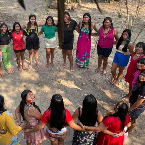 Grupo de cantores e cantoras Awa das Terras Indígenas Caru e Awa (MA), usam o canto para contarem suas histórias, falar dos seus significados e da experiência de compartilhá-los com plateias indígenas e não indígenas.